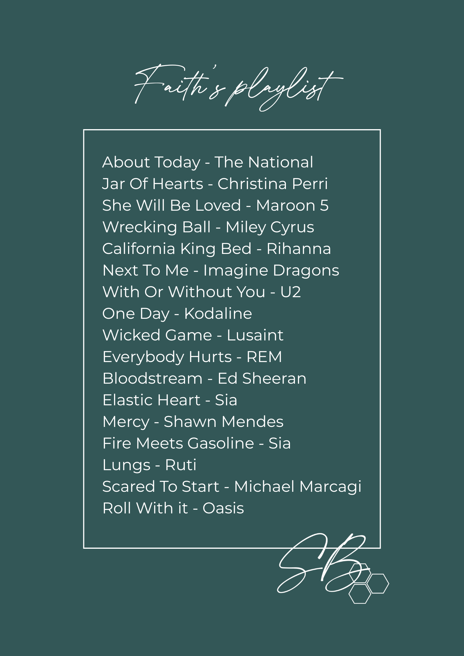 You'll also receive a copy of Faith's Spotify playlist, which are the tracks I listened to when I was painting her to help me get into the right zone and to summon her character. I hope you'll feel, as I do, that they add to her story.