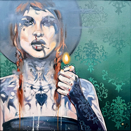 She's painted on a stretched natural linen canvas and framed by a chunky, heavyweight black frame in a gothic design which complements the wallpaper print in the painting. My signature gold bee sits on the bottom righthand corner of the painting, denoting a Sam Bee artwork.