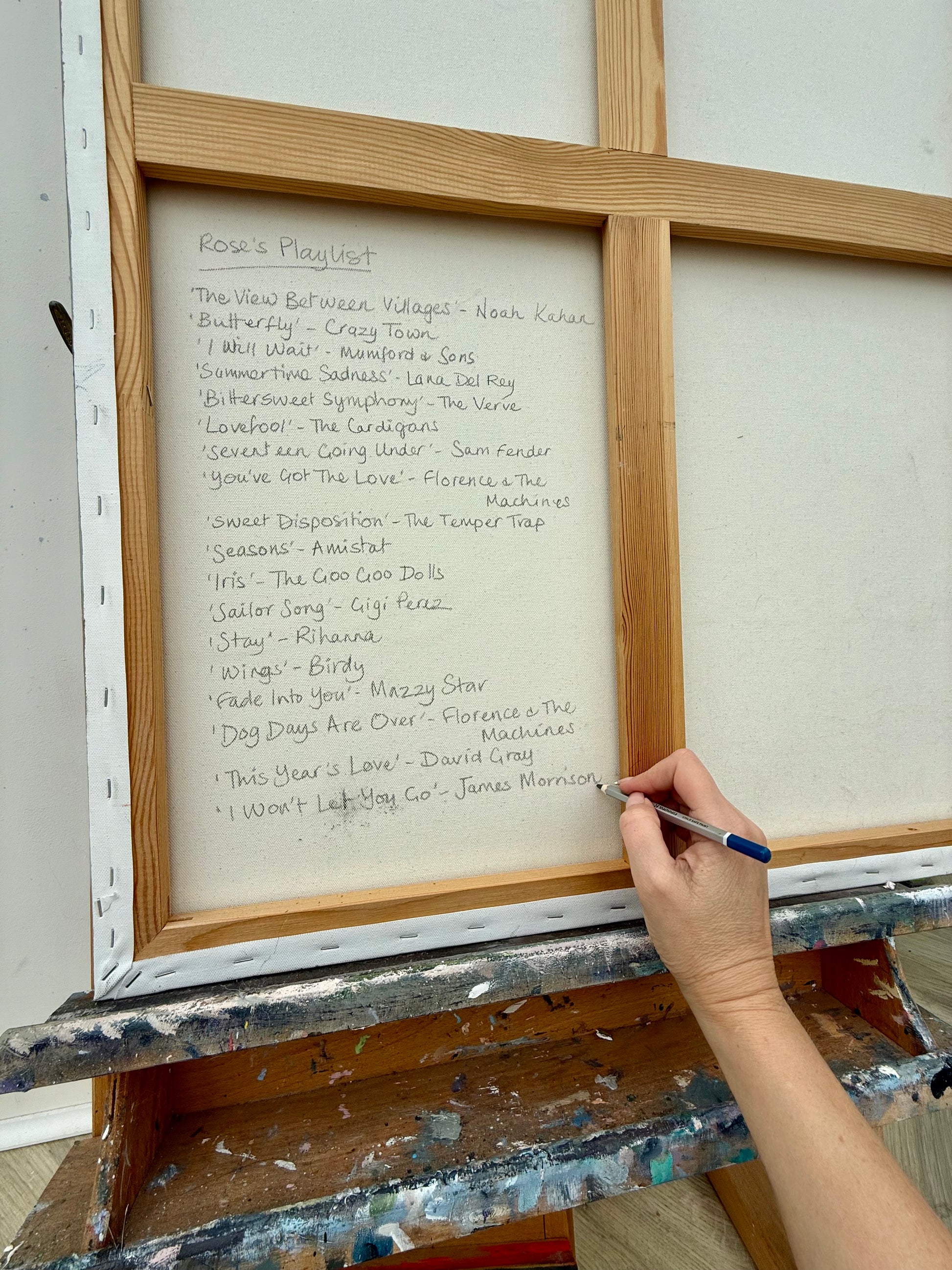 Rose comes with her playlist written in pencil on the back of the painting - this is the music I listened to when I was creating her, which seemed to me to summon her personality and to add to her story. She also comes with a handwritten letter of authenticity from me.