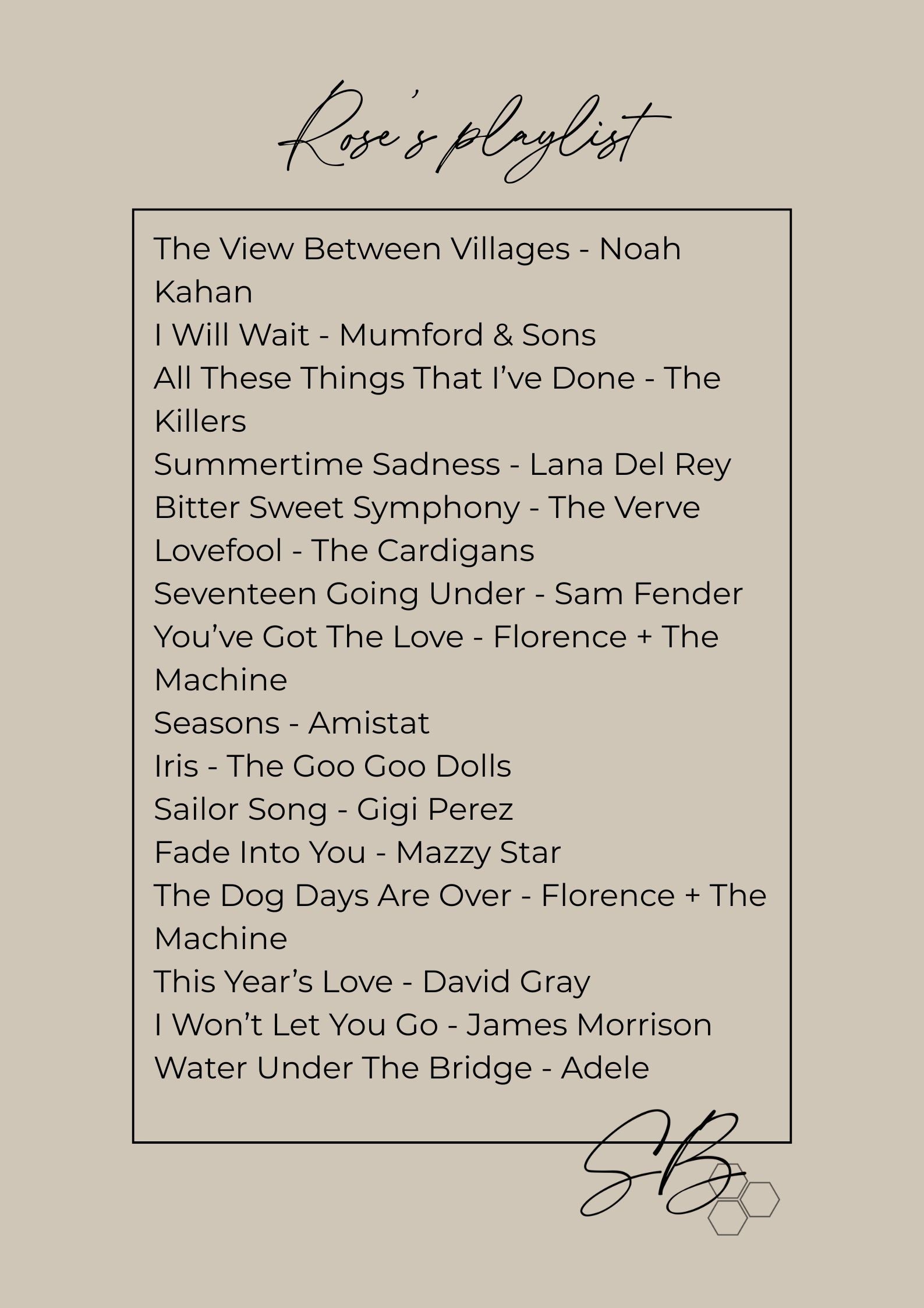 You'll also receive a printed copy of Rose's Spotify playlist, which are the tracks I listened to when I was painting her to help me get into the right zone and to summon her character. I hope you'll feel, as I do, that they add to her story.